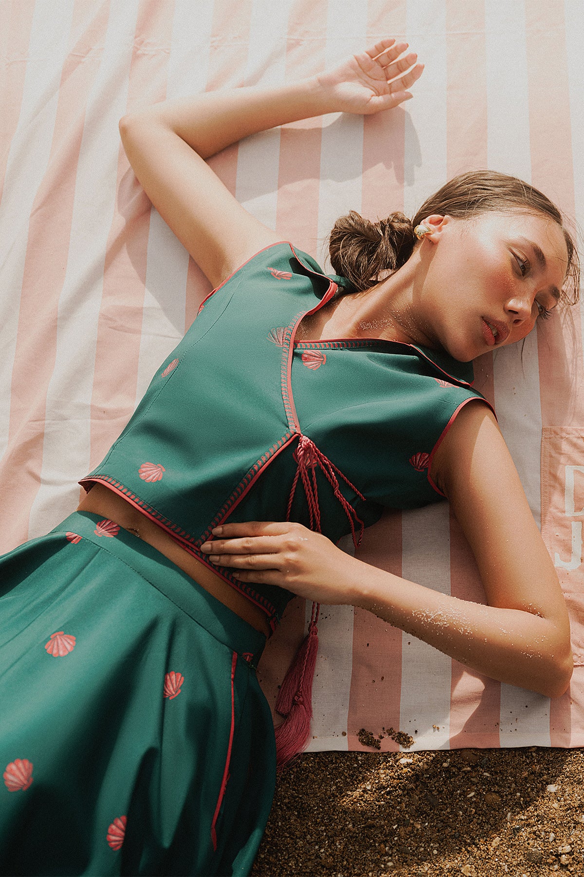 A teal georgette sleeveless shirt and printed skirt. Its sleeveless silhouette and fluid drape exude effortless fall sophistication.