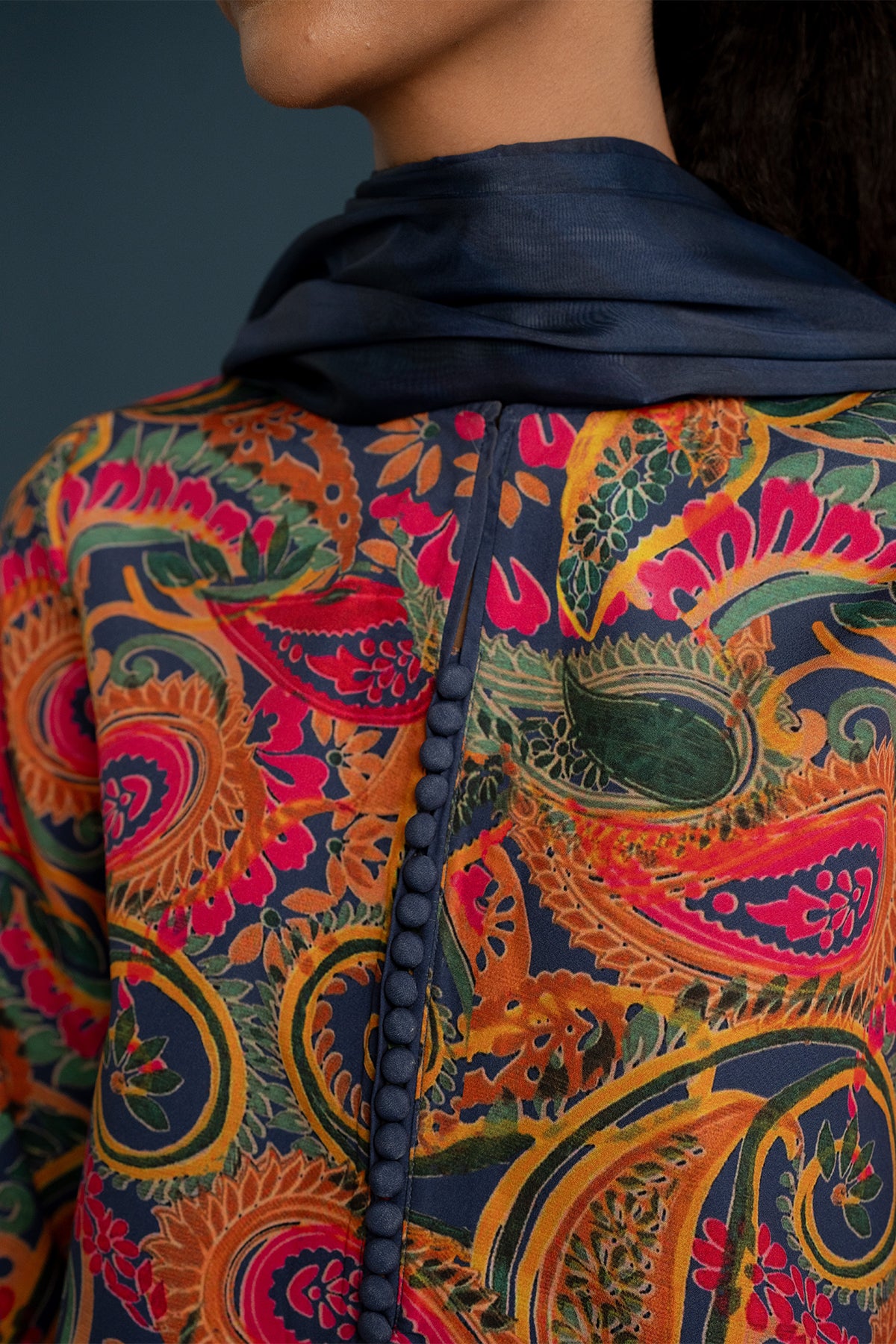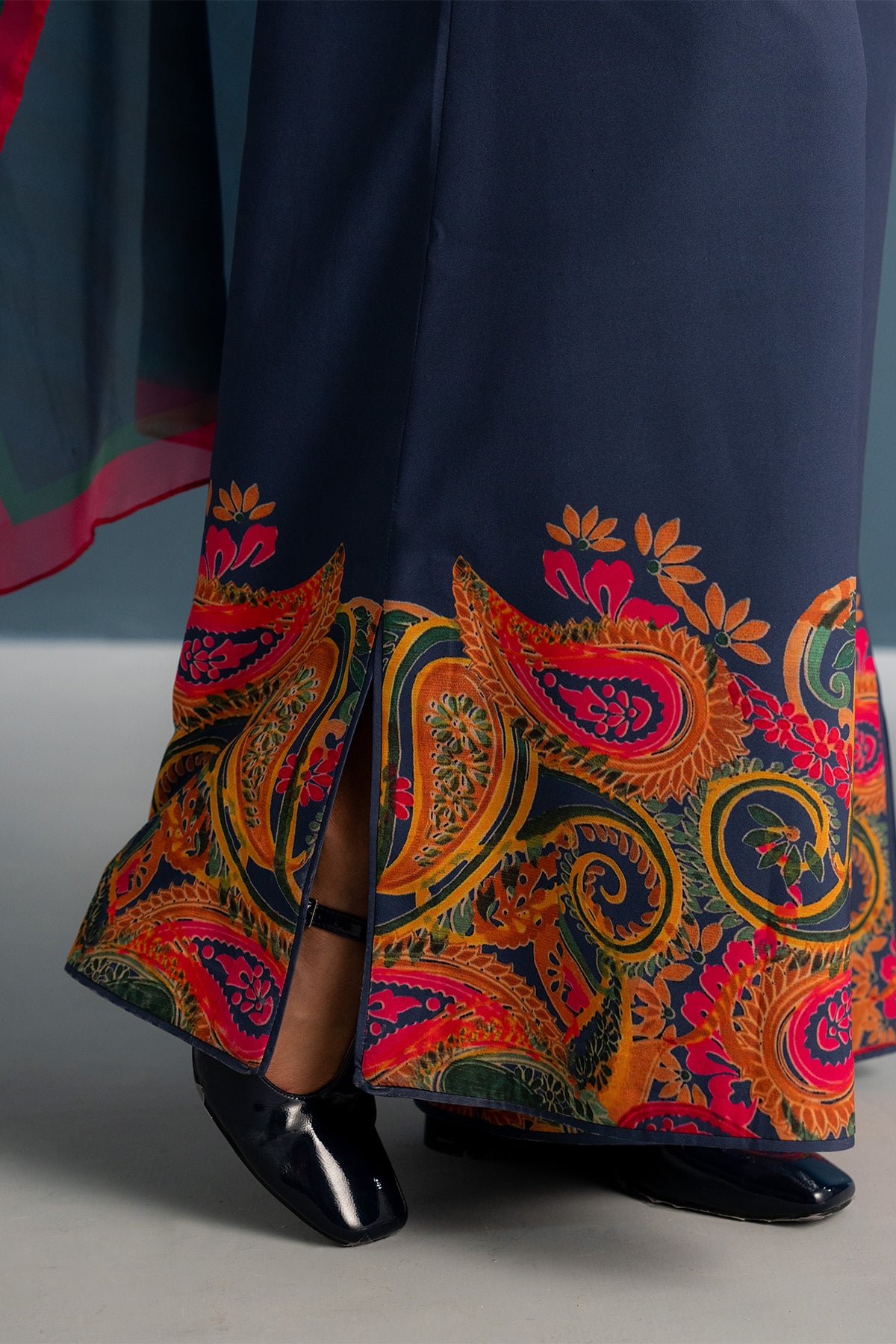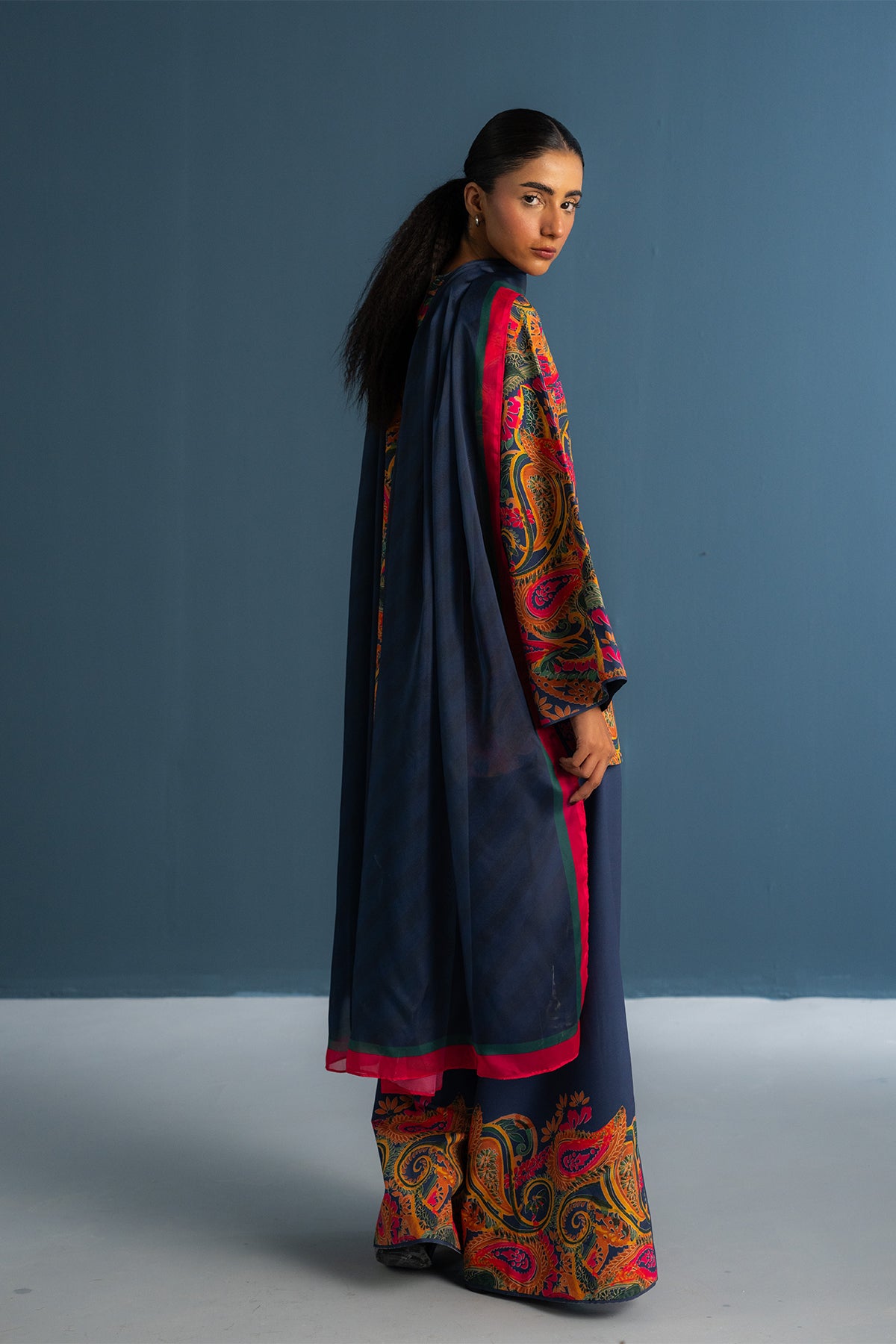 From head to hem, fully printed blue set with a silk dupatta that flows with finesse. Adding a touch of luxury and movement to every step.