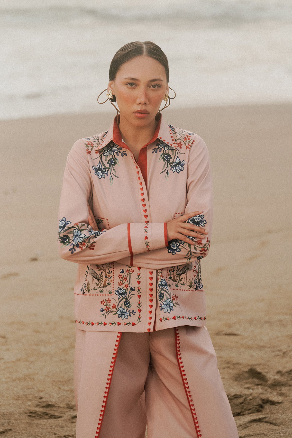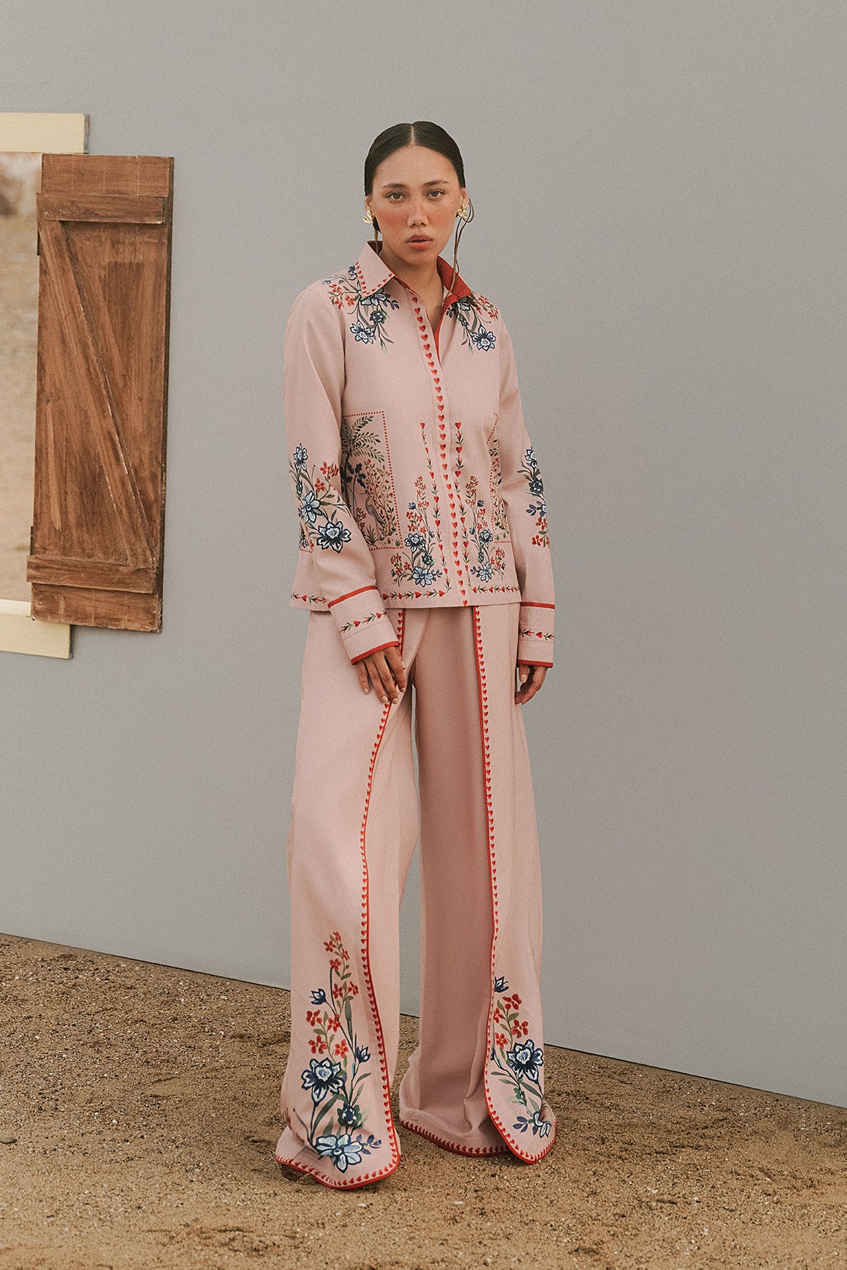 A blush pink georgette co-ord set adorned with intricate floral prints.