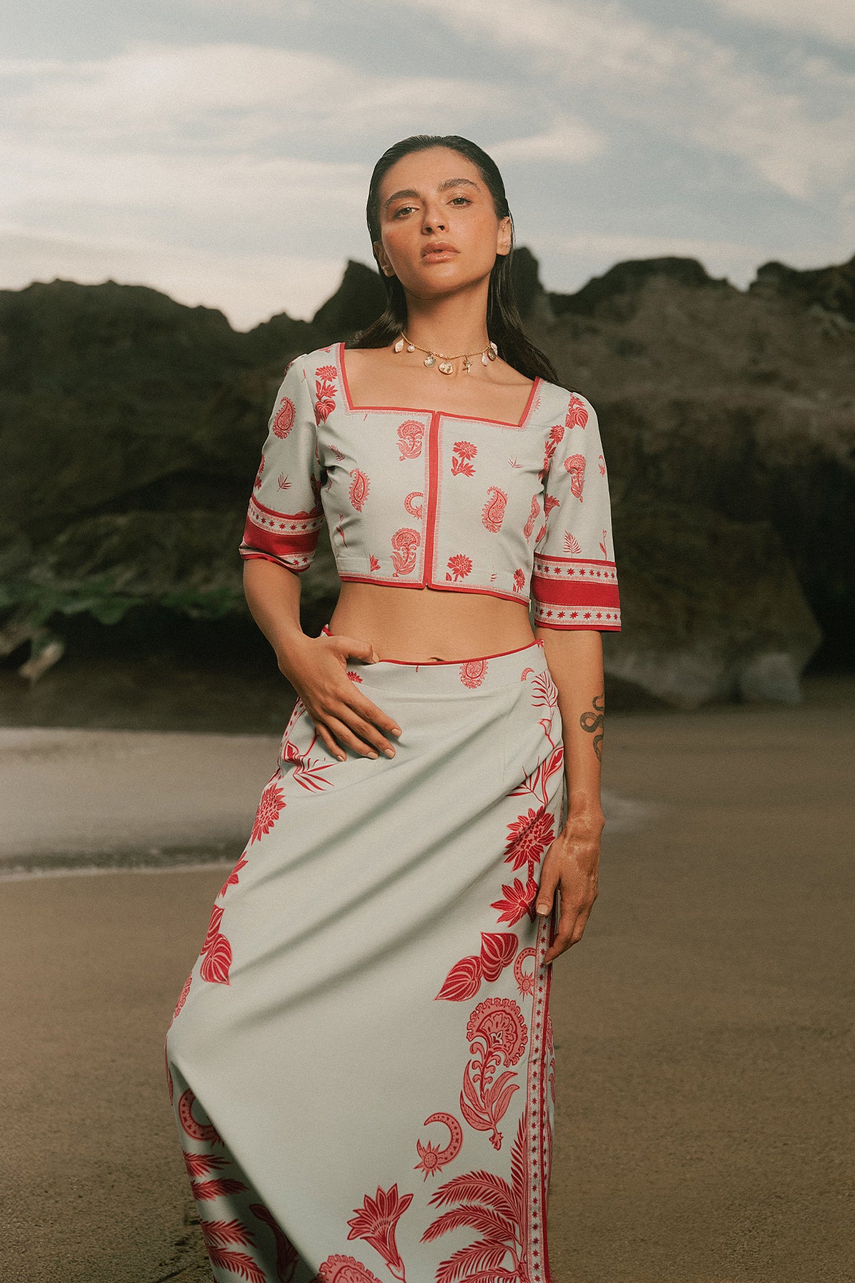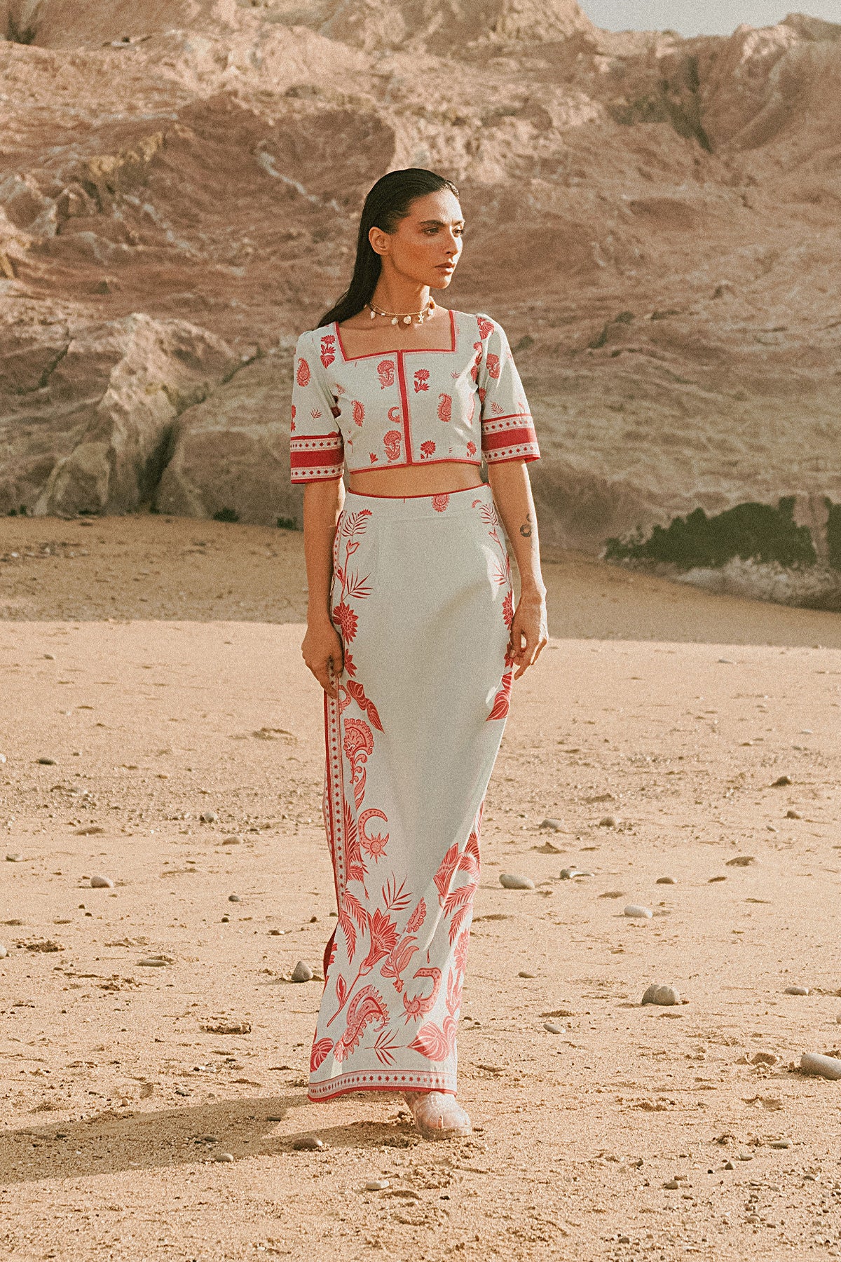 An ivory georgette crop-top and skirt set beautifully detailed with vibrant pink floral prints. The structured blouse and flowing skirt create a perfect harmony of tradition and modern allure. Ideal for festive celebrations or elegant resort evenings.