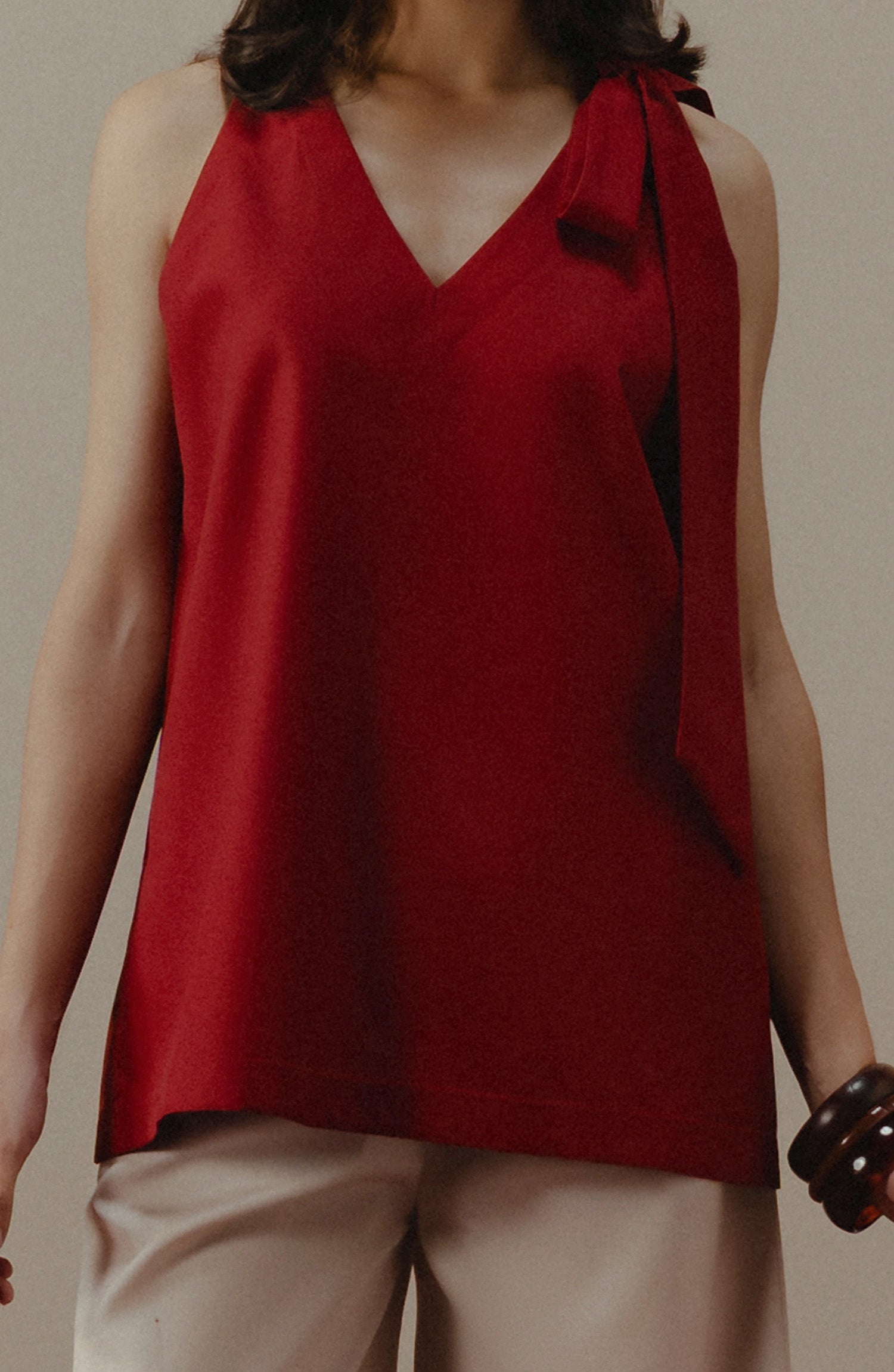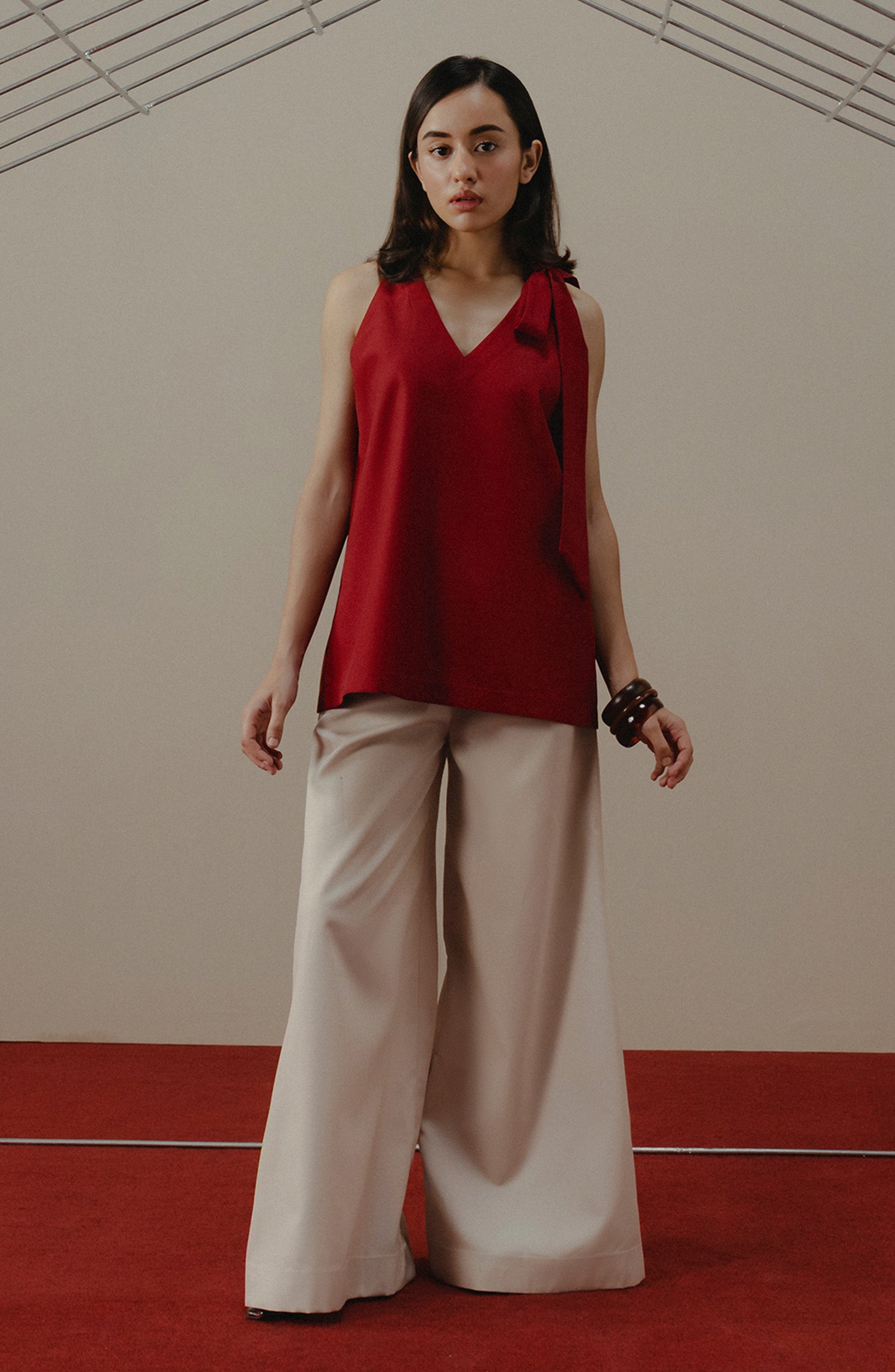 This sleeveless top in deep red features a V-neckline with a soft bow detail at the shoulder for a feminine touch. Paired with wide-legged ivory trousers, the look balances structure and ease.