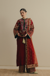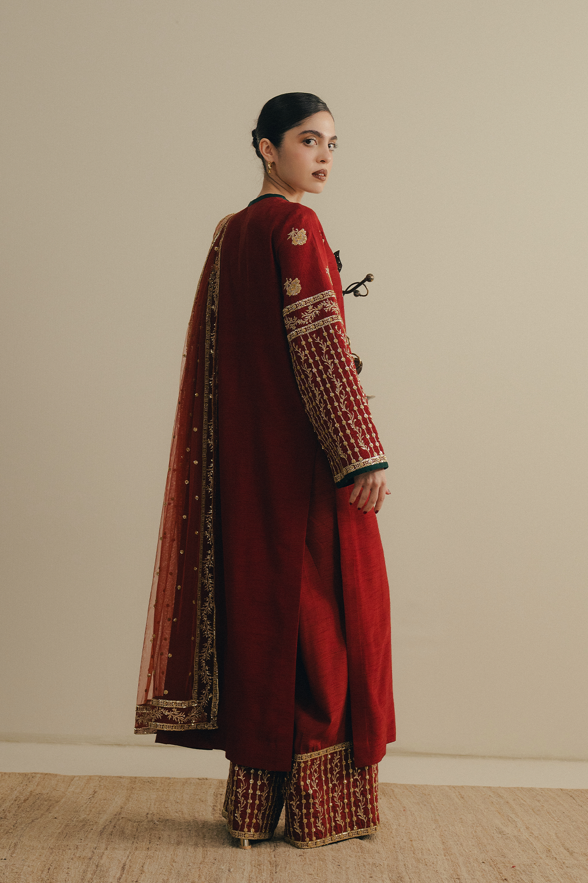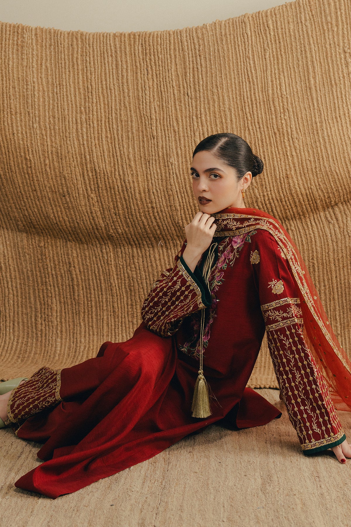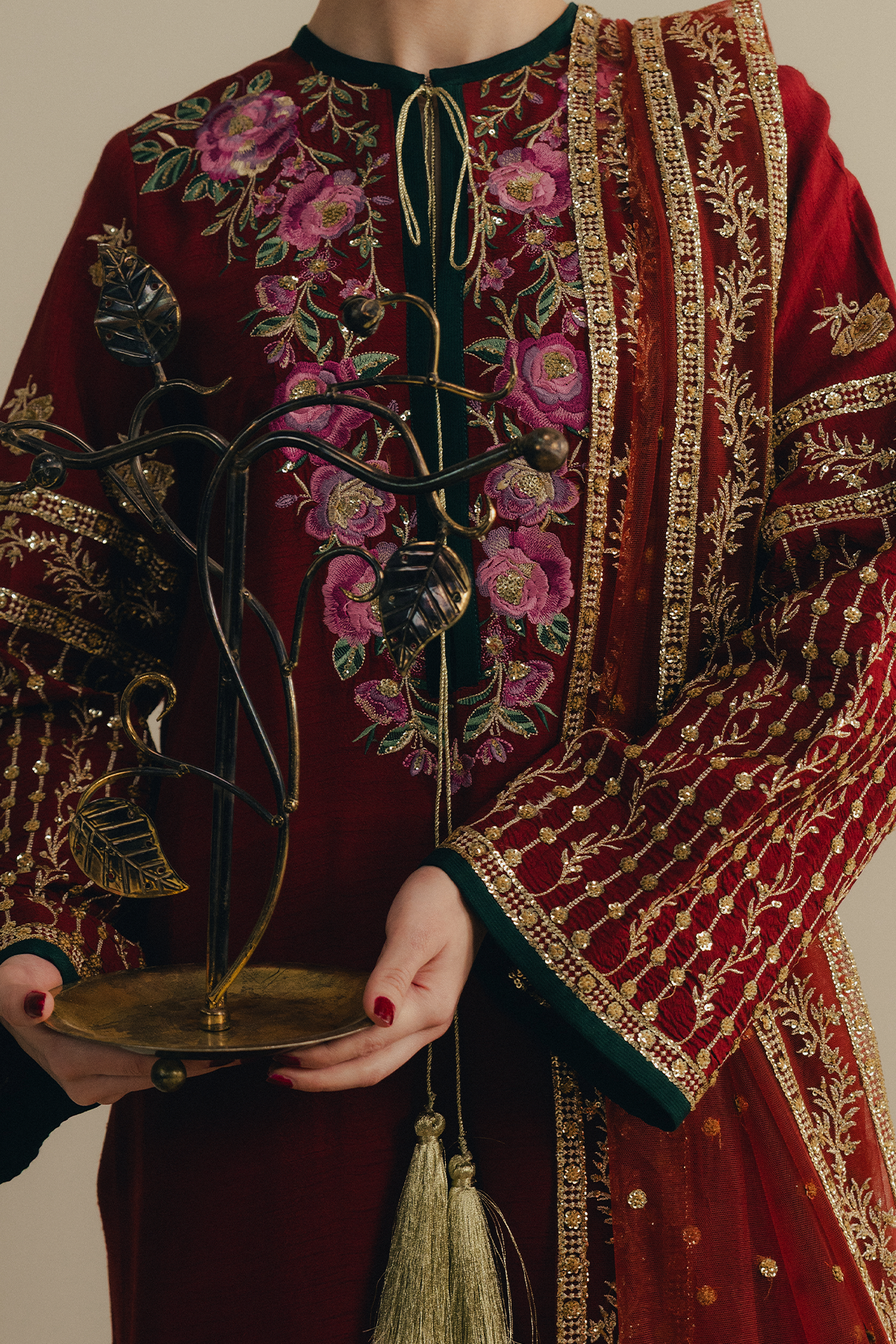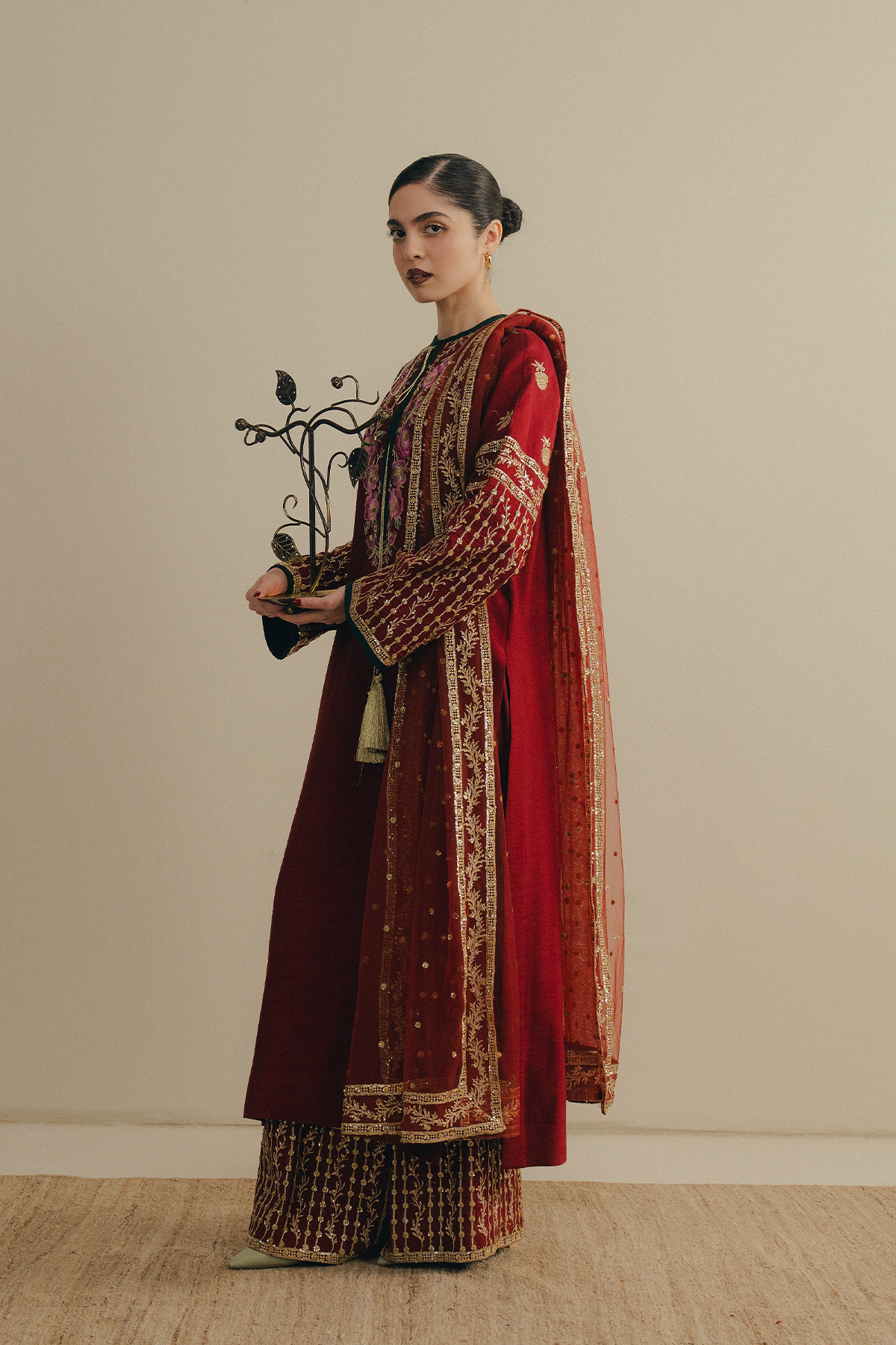 A crimson tapestry of floral and geometric embroidery, this dress speaks in threads of heritage and grace. Paired with wide-legged pants and adorned dupatta, it evokes a festive rhythm rooted in tradition.