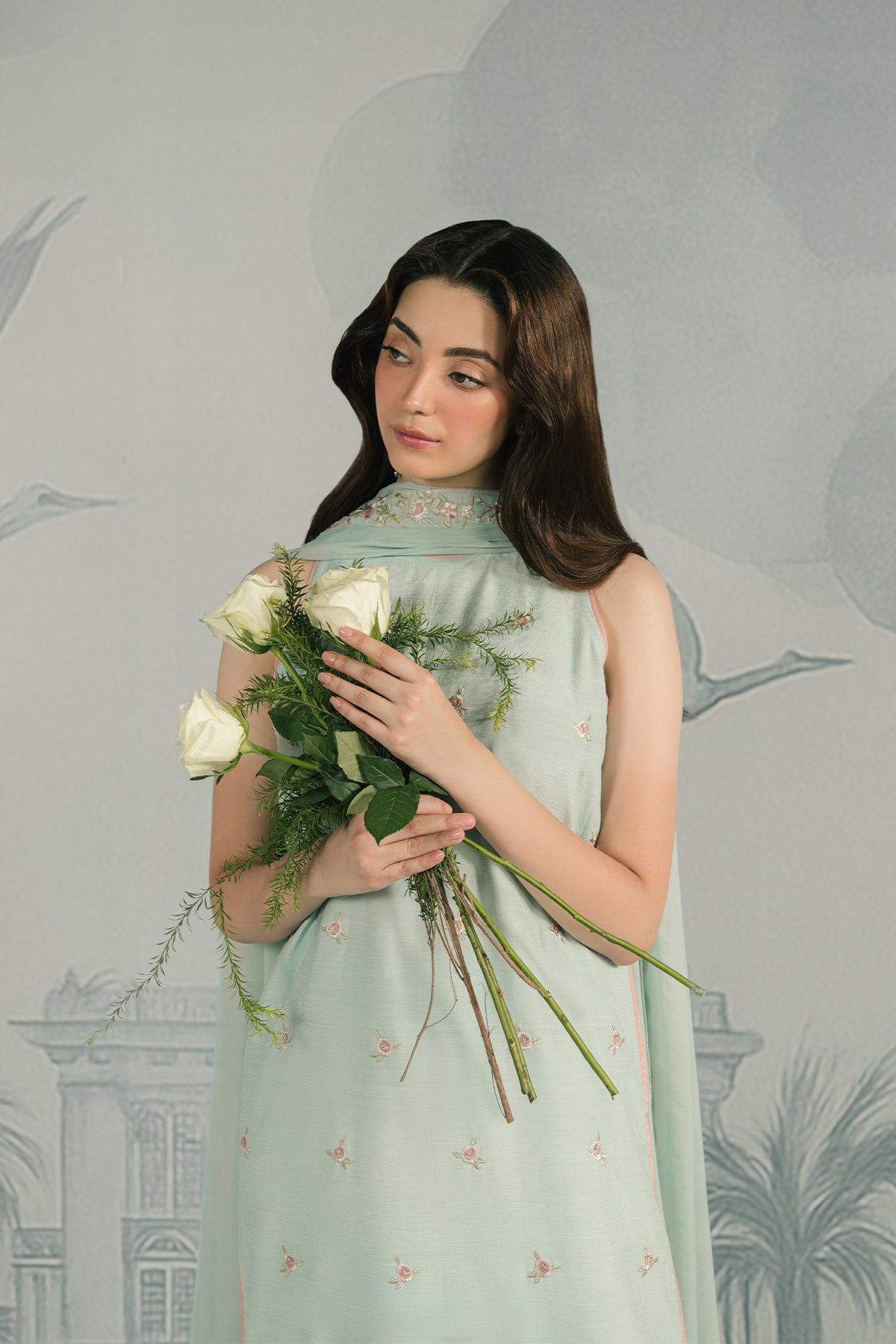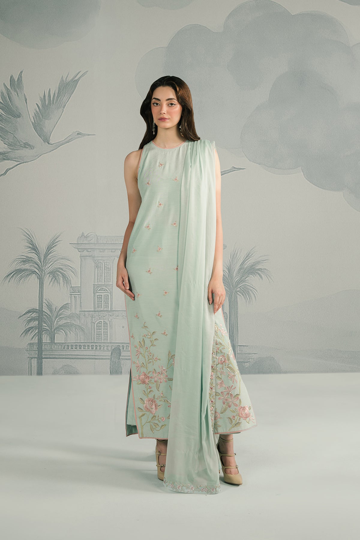 A powdery sky-blue raw silk long shirt, styled in a flowy straight silhouette, delicately embroidered with pastel floral motifs along the hem and sides. Paired with matching raw silk straight trouser and a pp chiffon dupatta draped effortlessly, the ensemble captures an ethereal charm