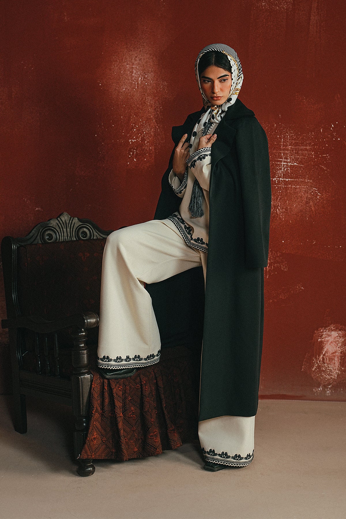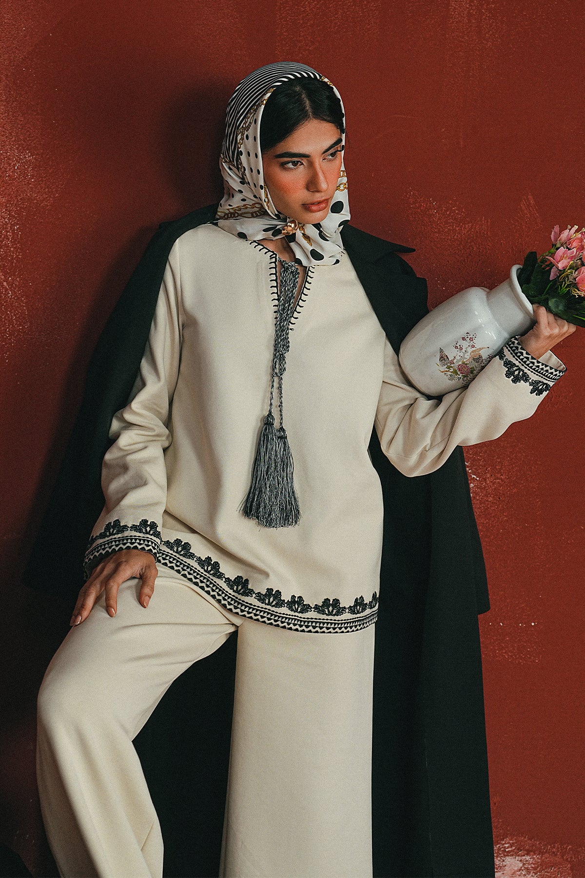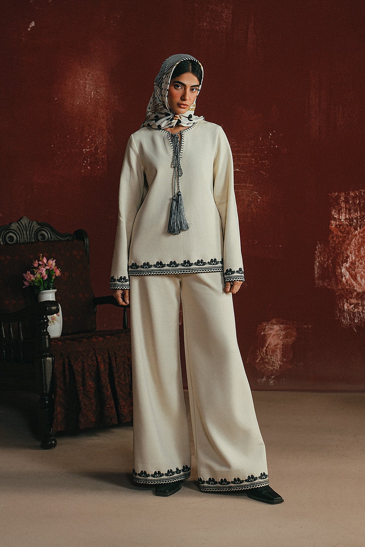 An ivory cord set finished with midnight-toned embroidery and tassel detail — a clean, winter-ready look that balances softness with statement.