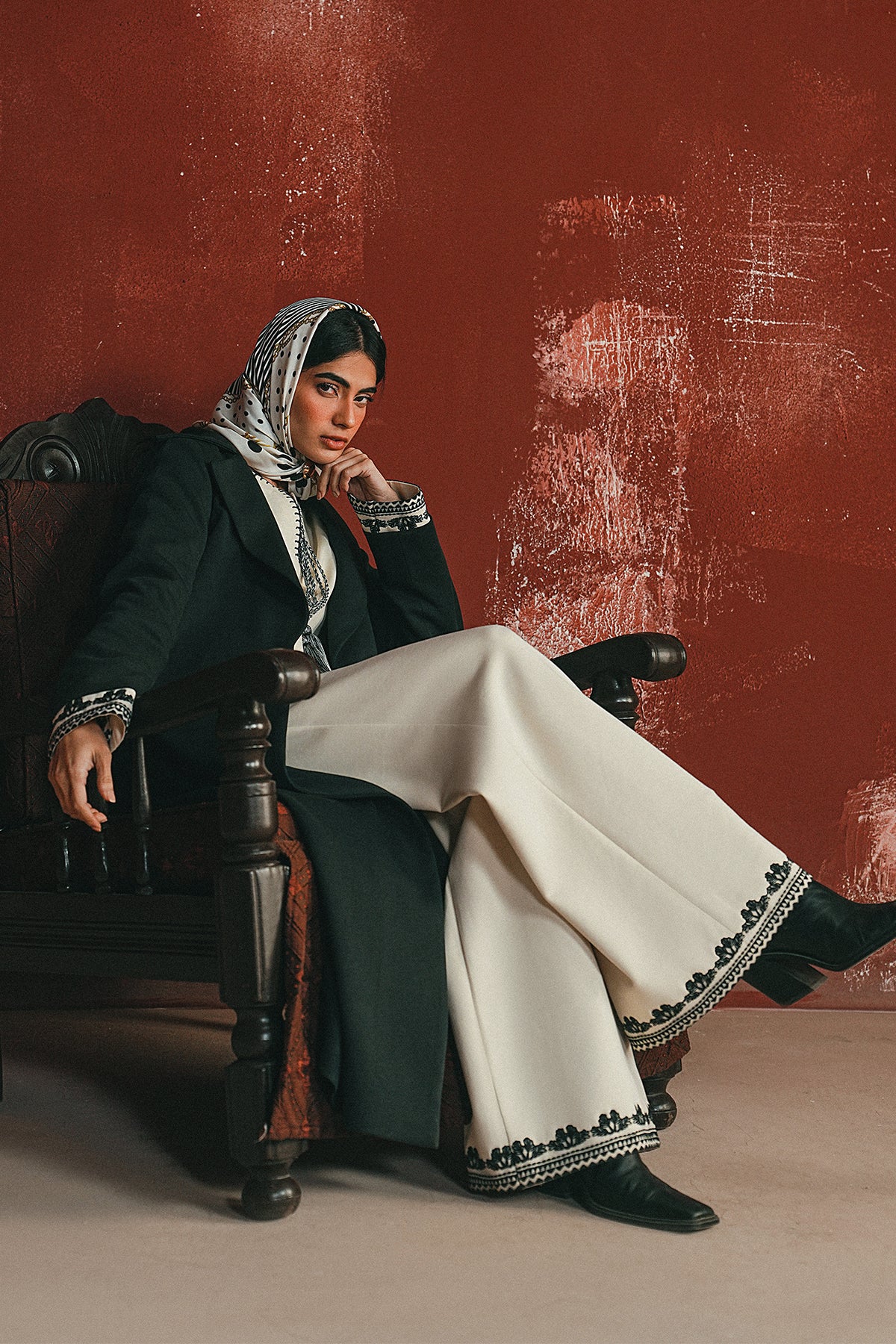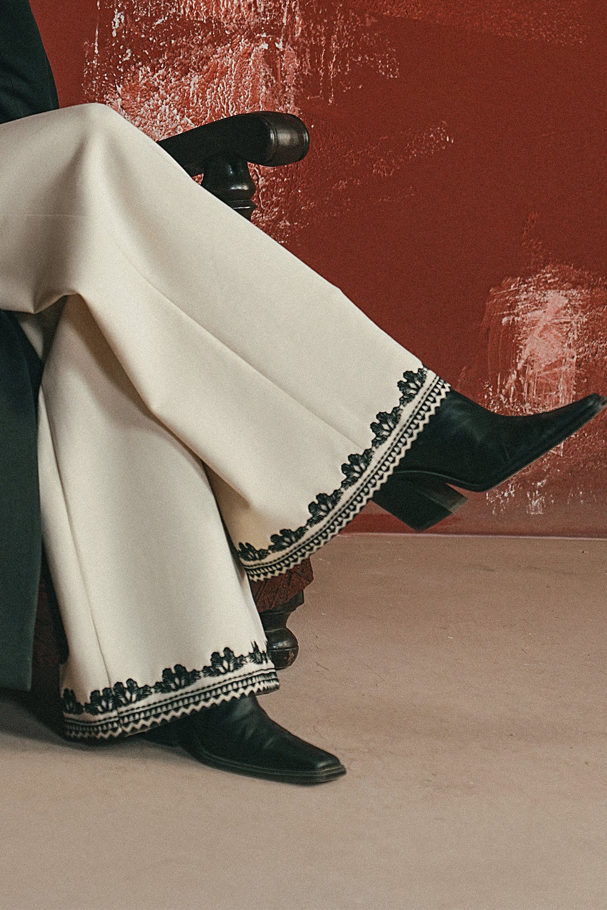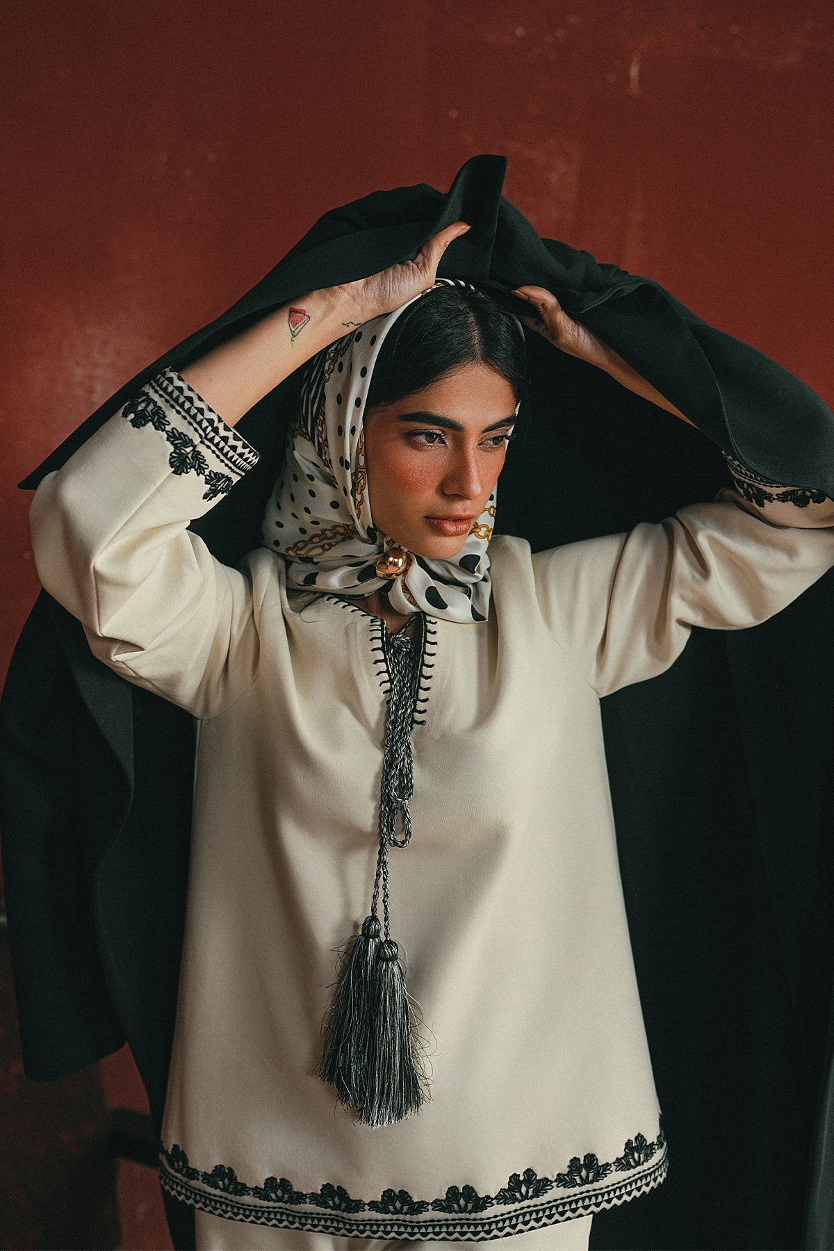 An ivory cord set finished with midnight-toned embroidery and tassel detail — a clean, winter-ready look that balances softness with statement.