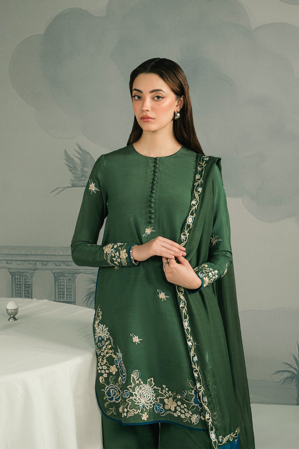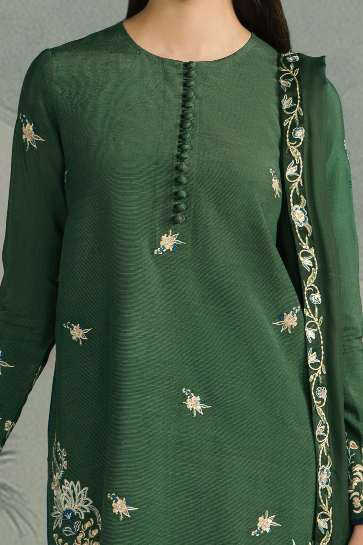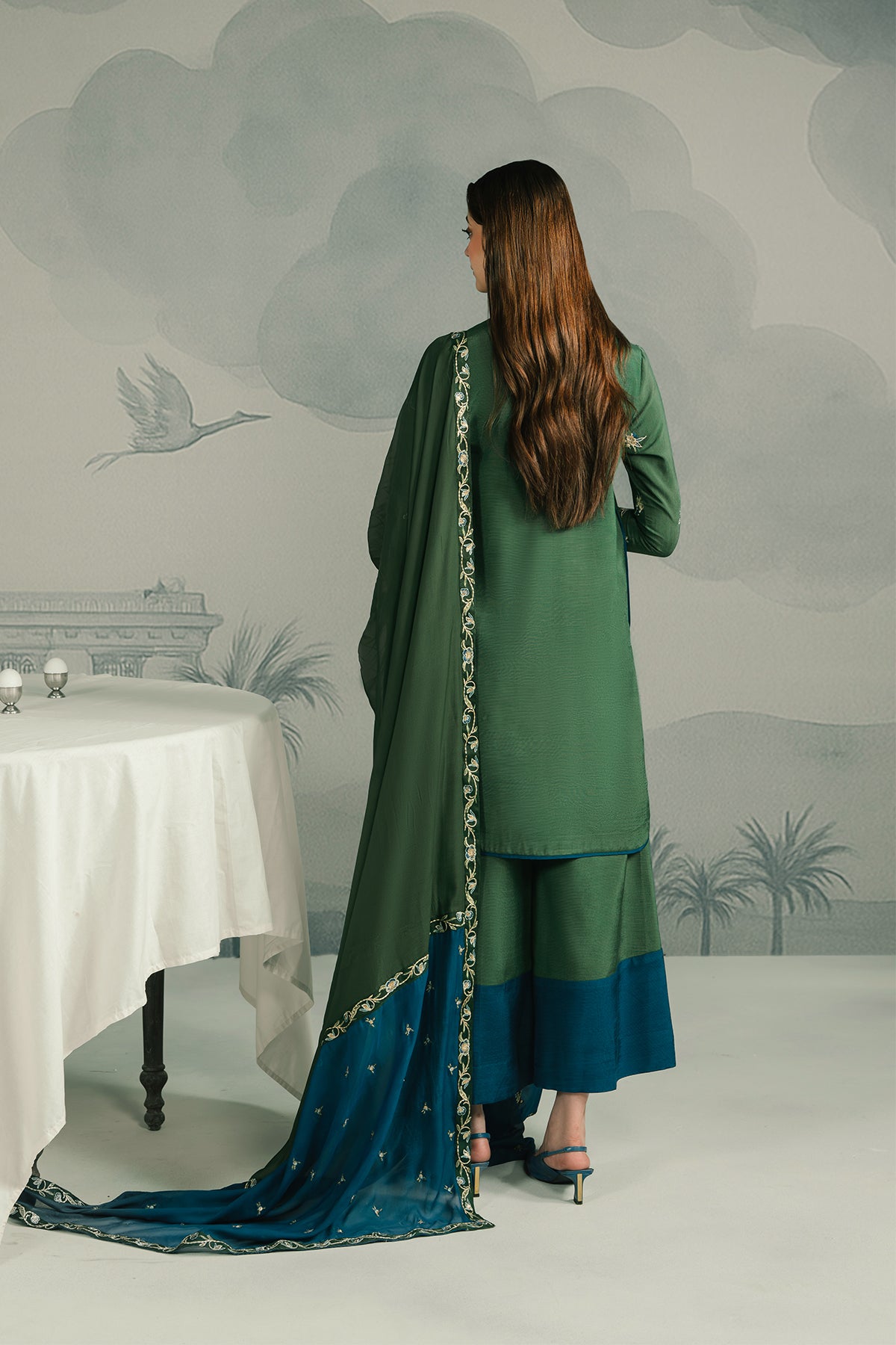An emerald green raw silk long shirt, delicately adorned with floral embroidery along the hem and sleeves, balanced with a sleek neckline detail for understated charm. Paired with wide trouser featuring a contrasting deep blue border loop button detail on neckline , the look is finished with a embrioded chiffon silk dupatta in matching hues — a graceful blend of freshness and elegance.